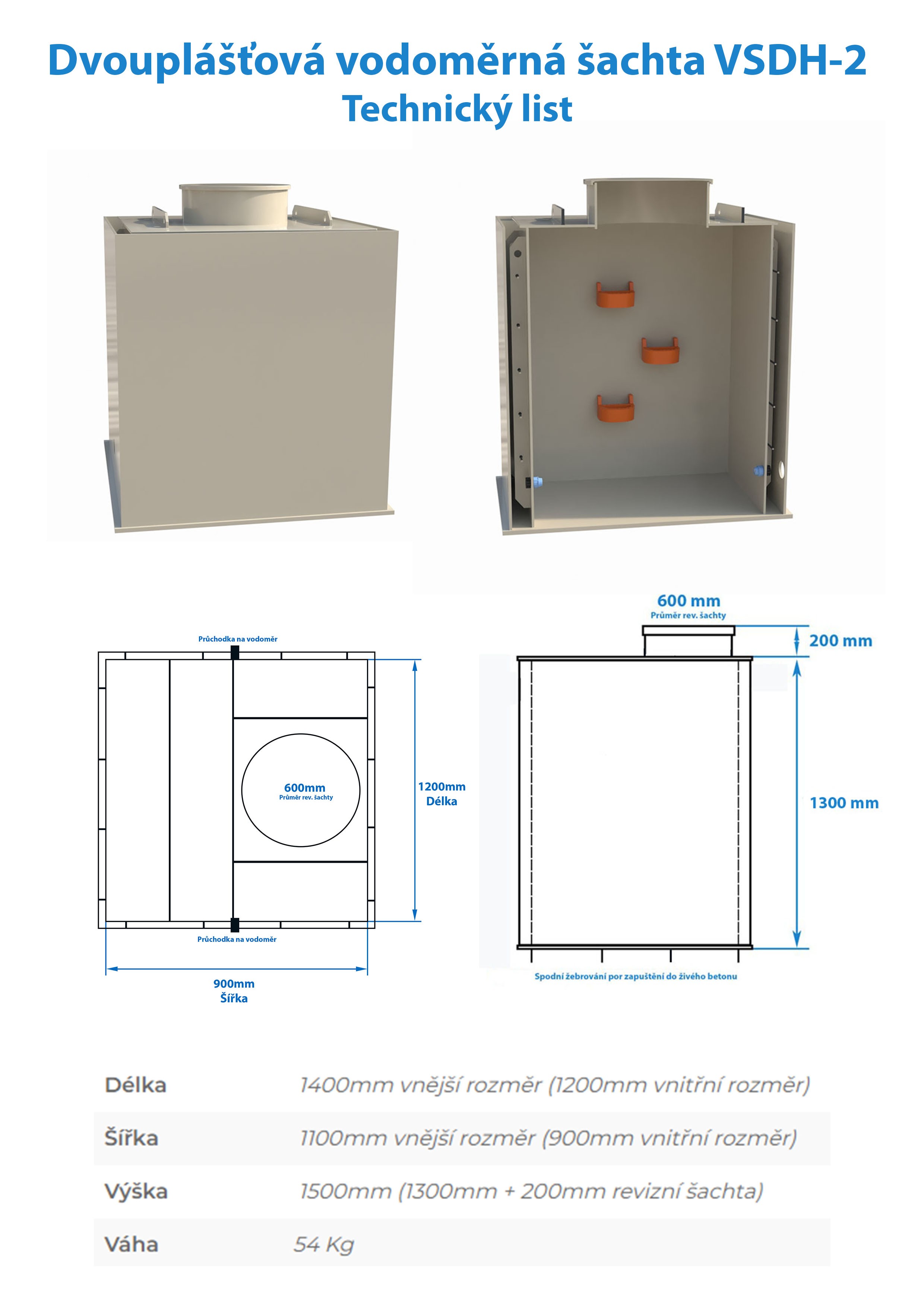 Dvouplášťová hranatá vodoměrná šachta VSHD-2 se doporučuje v místech s výskytem spodní vody nebo také jílovité půdy. Dvouplášťová šachta je vyrobena ze dvou 100% nepropustných plášťů. Meziplášť šachty je vhodné vyplnit betonem, aby se konstrukce nezbortila. Takto vybetonovaný meziplášť šachty zpevní konstrukci a odolá spodní vodě nebo jílovité půdě.